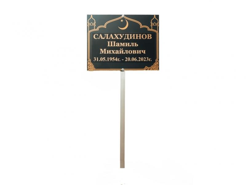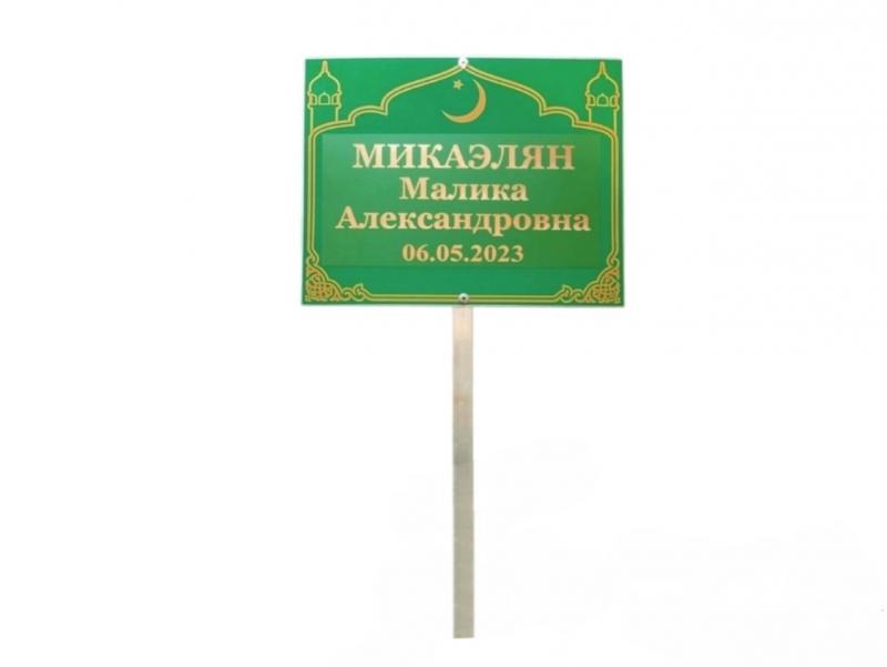 | ТАБЛИЧКИ мусульманские на заказ. Срок изготовления ритуальной таблички от одного дня. Материал таблички: Алюминий с виниловой поверхностью. Размер: 19х24 Цвет: Черный или зеленый. Цена: 1500р ТАБЛИЧКА на ножке (палочке) Материал ножки: Алюминий Цена: 2000р |