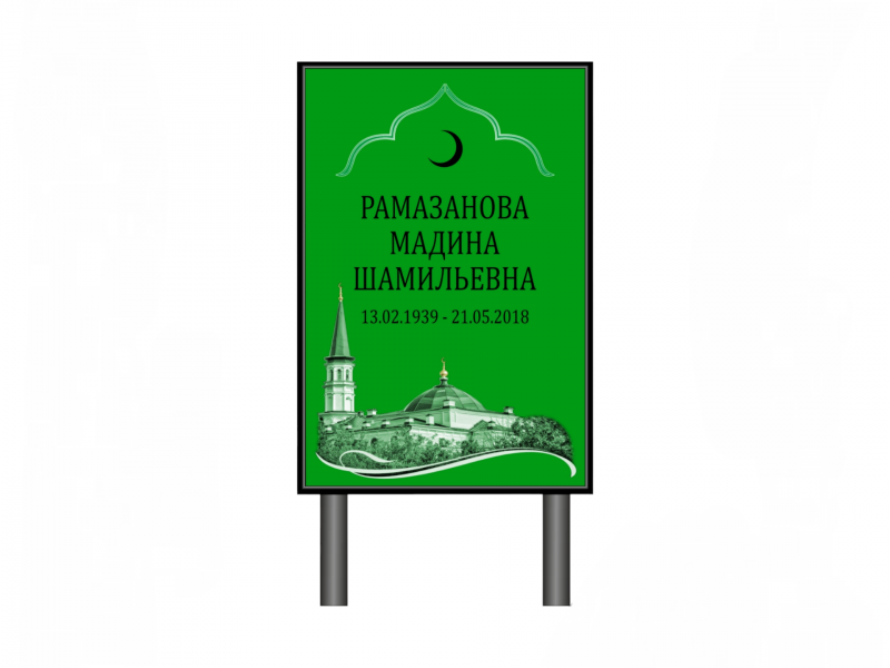 | ТАБЛИЧКИ мусульманские на заказ. Срок изготовления ритуальной таблички от одного дня. Материал таблички: Алюминий с виниловой поверхностью. Размер: 19х24 Цвет: Черный или зеленый. Цена: 1500р ТАБЛИЧКА на ножке (палочке) Материал ножки: Алюминий Цена: 2000р |